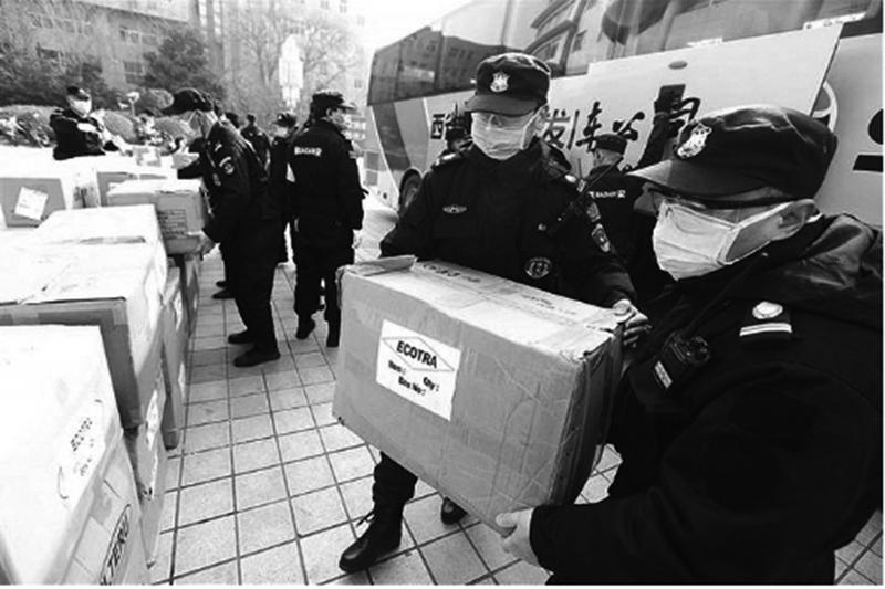 近日,陕西省慈善协会先后向西安市第八医院、唐都医院捐赠总价值131.94万元的负压救护车、防护服、隔离舱、医用一次性口罩、医用PVC检查手套等医疗物资。图为在唐都医院,工作人员搬运医疗物资。