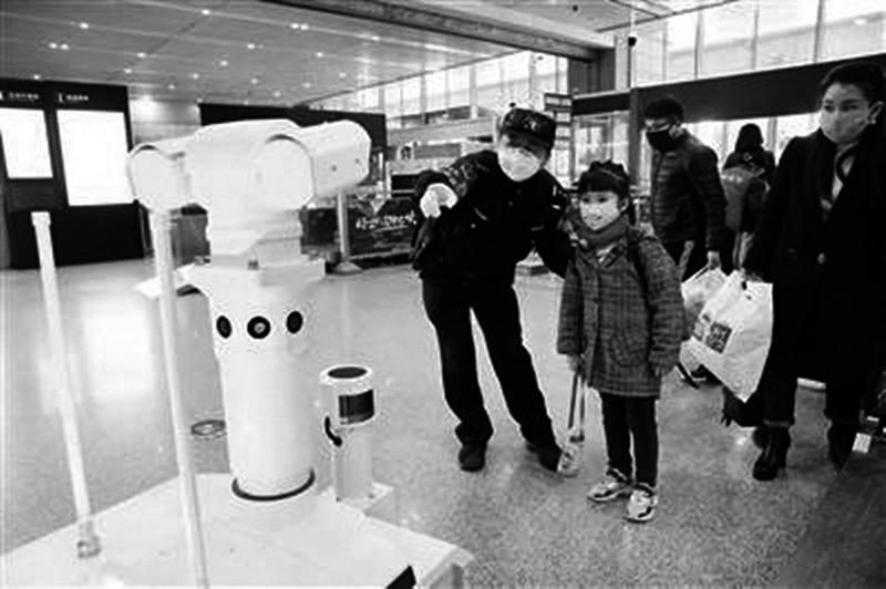 近日,正值复工复产高峰,为了让疫情防控措施更有效,在西安北站,西安铁路公安处挖掘自身警务科技能力,充分与铁路客运部门、地方防疫部门协作,在车站进出站口利用警用多功能机器人、红外测温仪等科技手段,及时高效的对旅客进行身份核查、人脸识别和体温检测,确保旅客出行平安。图为智能机器人助力民警对旅客进行异常体温筛查。