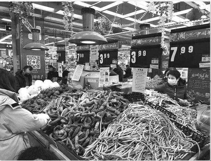 疫情防控期间位于西安市雁塔北路的华润万家超市蔬菜供应充足顾客购物秩序井然
