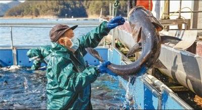 17日,浙江淳安县千岛湖淳鱼销售中心码头,工人正在将活鱼装车,准备配送到福州。