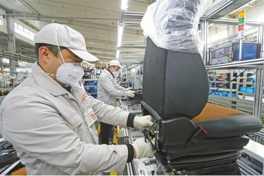 近日,中德合资西安伊思灵华泰汽车座椅有限公司操作工在装配线上测试座椅气密性并排线。该企业主要为中国一汽解放、中国重汽、陕西重汽等国内汽车制造业提供优质配套。去年企业实现年产值7.5亿元。该企业自2月18日复工复产以来,一手紧抓防疫,一手紧抓生产,全力追赶年度生产目标。肖晓良摄