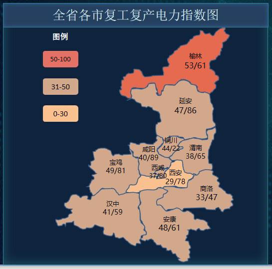 陕西省各地市复工复产电力指示图 2月28日,陕西省省长刘国中到国网陕西省电力公司(以下简称国网陕西电力)调研工作时,对国网陕西电力在确保疫情期间900余万用电客户安全可靠供电的同时,深挖电力大数据助力企业复工复产工作予以肯定。通过深化电力大数据应用,国网陕西电力高效整合利用电力大数据资源,主动支撑政府实施精准防疫,在助力社区疫情防控、助推企业复工复产、跟踪服务重点项目等场景得到实践应用,赢得了各级政府领导和电力客户的广泛点赞。