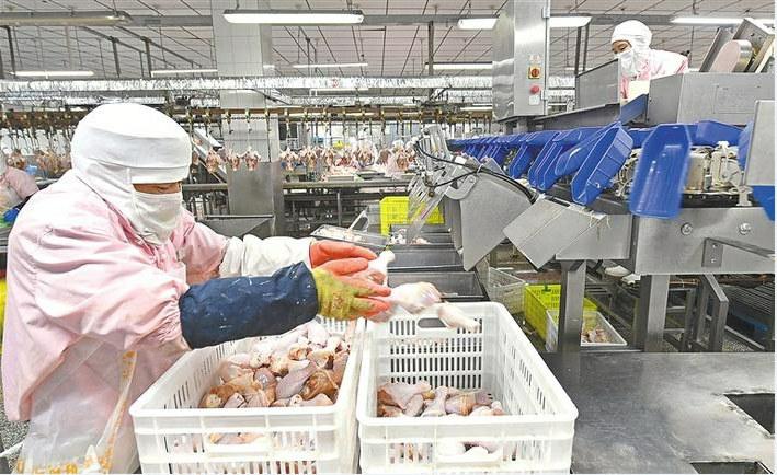 3月1日,工人在陕西好邦食品有限公司鸡肉加工生产线作业。作为陕西省鸡肉加工龙头企业,好邦食品有限公司目前已全面恢复生产,日产鸡肉200吨以上,产能恢复到疫情前水平。