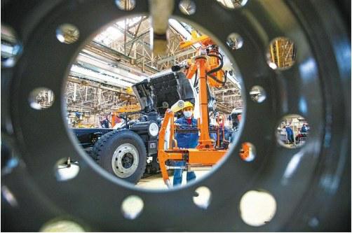 连日来,陕汽统筹抓好安全风险防控,科学有序复工复产。截至目前,产业园实现规模化复产,全面恢复“双班”制,日产重卡300辆以上。图为工人在总装配线上忙碌着。
