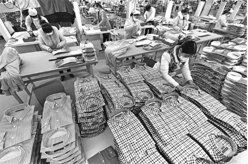 近日,工人在勉县恒泰服饰有限公司就业扶贫车间整烫包装生产线上作业。自2月20日复工复产至3月4日,该公司累计生产男士高端衬衫9000多件,实现产值180万元。