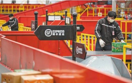 近日,工作人员在西安顺丰速运有限公司西北分拨中心陆运枢纽分拣快递。疫情发生后,西安顺丰速运有限公司服务不中断,其西北分拨中心陆运枢纽日均处理收发件超过60万件。
