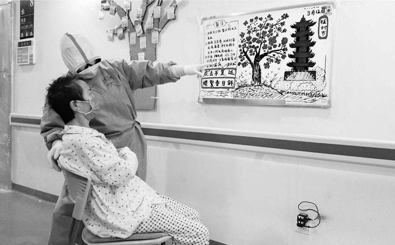 3月15日,在医护人员的陪同下,患者兴致勃勃地欣赏着隔离病区墙上的“樱花树”,憧憬着未来美好的生活。这棵美丽的“樱花树”是西安交大一附院援武汉国家医疗队护士张海萍画的。“疫去不复返,樱繁春日斜”,张海萍用绚烂的画笔,描绘了一幅春日里绿草茵茵花枝俏的美好景象。