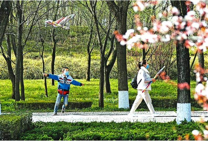 春天的宝鸡,花红柳绿,春意盎然。随着疫情防控形势逐步向好,宝鸡市民的生活秩序加快恢复,市民们带着孩子来到户外,踏青赏春,乐享春光。图为在宝鸡渭河生态园里,小朋友正在放风筝。
