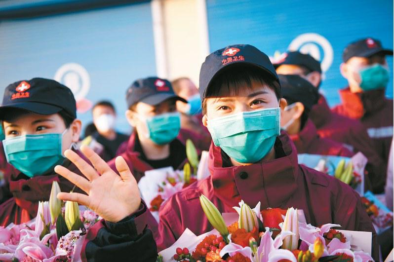 随着湖北新冠肺炎疫情形势好转,3月17日,援鄂医疗队开始有序撤回,陆续抵达各地。图为抵达陕西西安的医疗队队员向前来迎接的人员挥手致意。