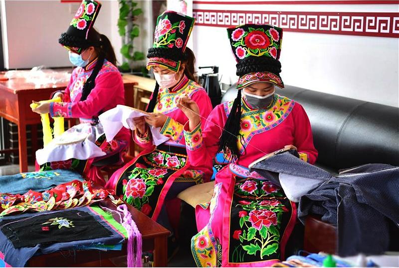 陕西汉中市宁强县大安镇江林安置点于2018年8月底竣工,目前安置来自周边村镇的搬迁户2010户7800余人。这里从最初河边的一片荒滩地,变身产业丰富、配套齐全、生活便利的现代化社区。图为在一家羌族刺绣文化公司的传习基地内,学员在进行练习。