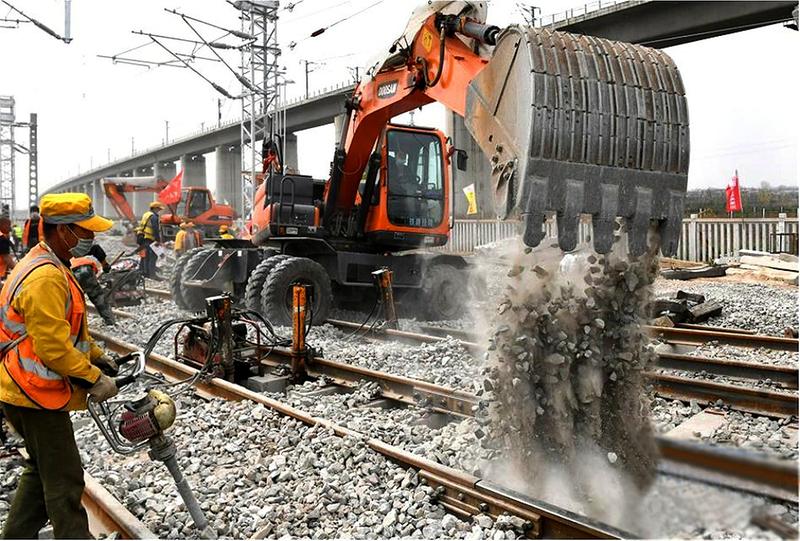 近日,由中铁上海工程局承建的银西高铁陕西段茂陵站完成首次转线换装施工,成功将西平增建二线与陇海线接驳,初步实现了对陇海线的运营压力分流,为后续银西高铁建设开通奠定基础。银川至西安高速铁路是国家中长期铁路网规划中“八纵八横”高铁网包(银)海通道的重要组成部分。图为工人在银西高铁陕西段茂陵站首次转线换装施工现场作业。