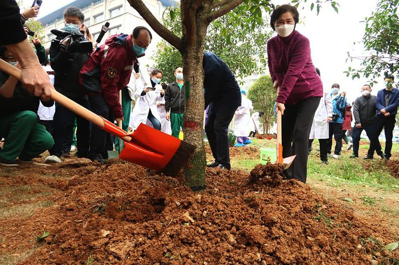 3月23日上午,武汉大学人民医院东院举办白衣逆行,共迎春天——支援东院医疗队同心共植“感恩林”活动,西安交大一附院施秉银院长同李兰娟院士、武汉大学人民医院王高华院长、四川大学华西医院康焰教授共同植下象征感恩、友谊和希望的树。西安交通大学第一附属医院援武汉国家医疗队部分队员代表参加了植树活动,共同栽下了一棵名为“秦劳勇敢”的友谊之树。