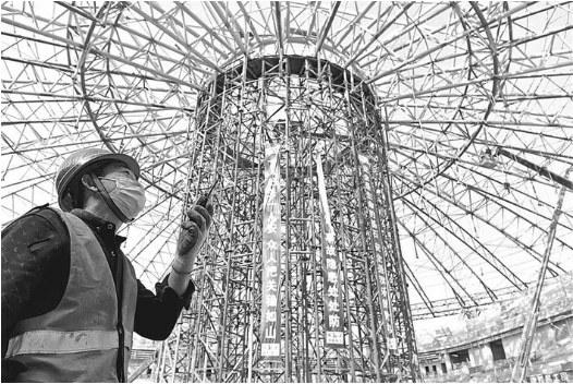 十四运会场馆——西北大学长安校区体育馆已全面复工。连日来,施工现场的工人们佩戴口罩、安全帽,正在加紧建设。