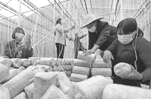 近日,商洛市柞水县杏坪镇柴庄社区蔡家院子吊袋木耳大棚基地内,农户正在码放菌包。据悉,该镇大力推行“借棚还耳”“借袋还耳”模式,目前205个大棚全部由99户贫困户认养,户均年增收2万元。