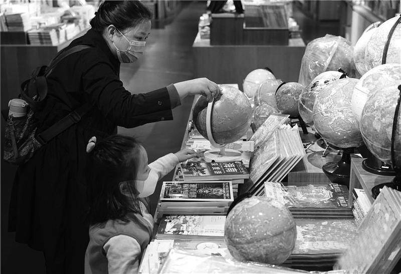近日,陕西西安市的商场、花市、书店等经营场所有序恢复营业。图为在西安市曲江新区一家书店内,一位顾客带着小孩选购地球仪。
