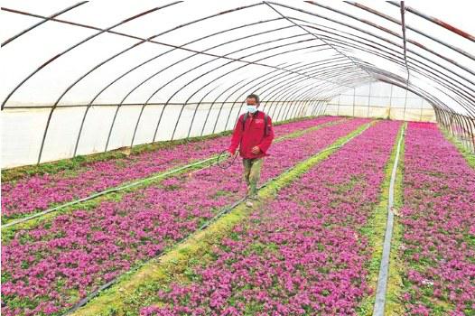 西安市鄠邑区涝店镇谭贾滩村双丰种养殖专业合作社,主要从事苗木、蔬菜、花卉等农产品的培育及销售。合作社带动了涝店镇3个村集体经济发展。图为工人在给芝樱喷药。