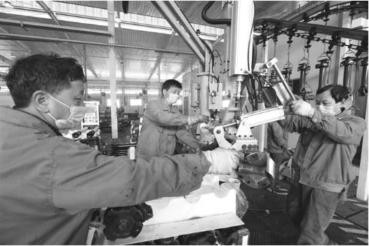 陕汽集团陕西蓝通传动轴有限公司坚持疫情防控、复工复产两手抓、两不误,目前企业复工率100%,返岗员工全力以赴投入生产,传动轴日产量1300根以上,预计年产量48万根,年产值3亿多元。图为工人在涂装线上工作。