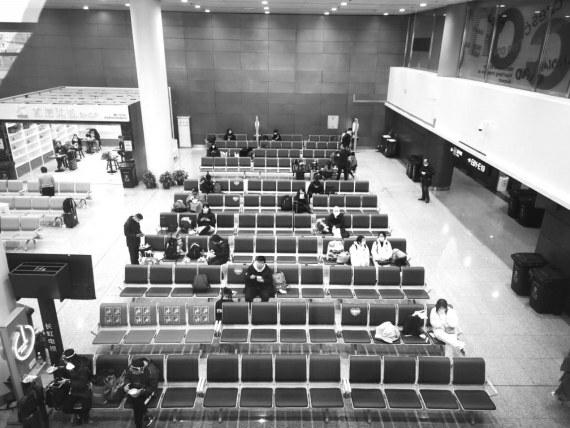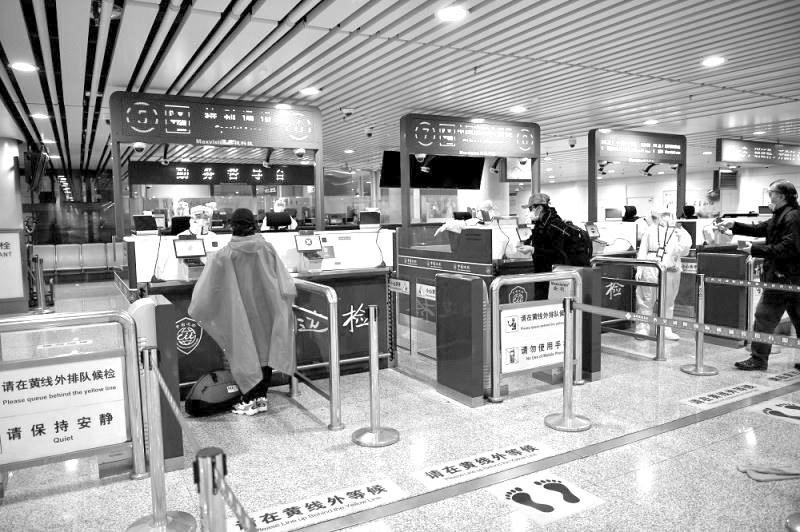 6:00,入境旅客下机,海关工作人员对旅客进行健康申明卡初审,对申报有症状的旅客进行分流。