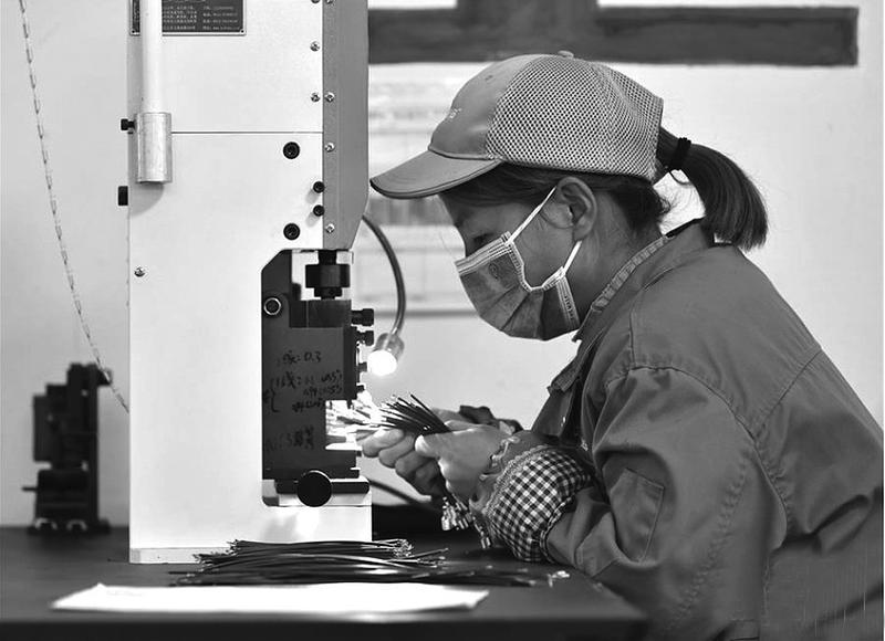 近年来,陕西省咸阳市乾县在脱贫攻坚战中,按照“企业(合作社)+工厂(车间)+贫困劳动力”的发展模式大力推进社区工厂建设,吸纳困难群众在家门口稳定就业持续增收。图为工人在该县阳峪镇太平村浩泽社区工厂工作。