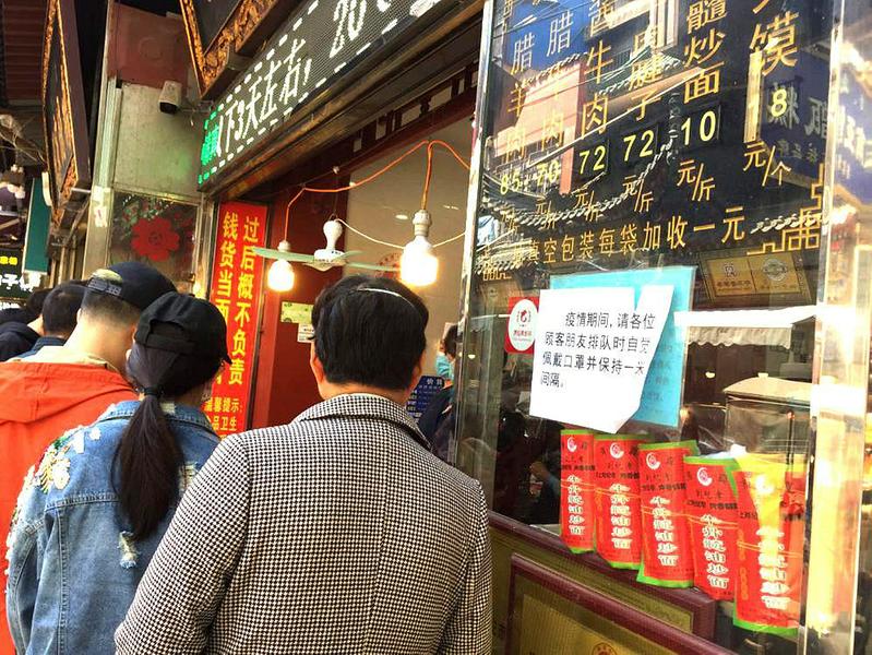 4月8日,在回民街这一餐饮业比较密集的区域,据记者观察,坊内商家基本已经开始营业,每家商户都会在门口贴上“店铺已消毒,顾客进门需戴口罩”等标语。在疫情之下,回民街影响比较大,虽商铺大部分已开门营业,但游客依然较少,客流量不大。