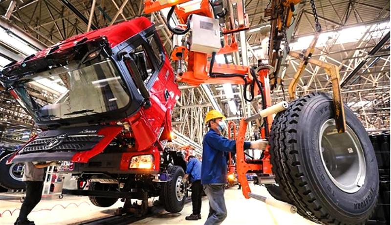 陕西汽车控股集团有限公司启动生产以来,通过打通外部物流配送通道,最大化利用现有资源,合理排产,保障每天计划顺畅执行,稳妥推进复工复产。图为工人在生产线上工作。