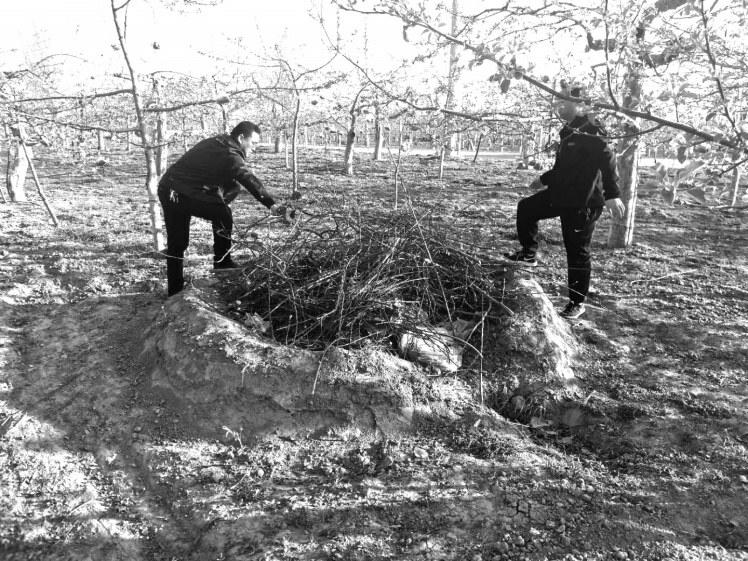 不远处,富县果业局副局长曹晓军正在指导果农堆柴垛:“看好上风向位置,一亩果园堆8到10堆,铺上秸秆、杂草、果枝,盖点土,命令一到就点火。”