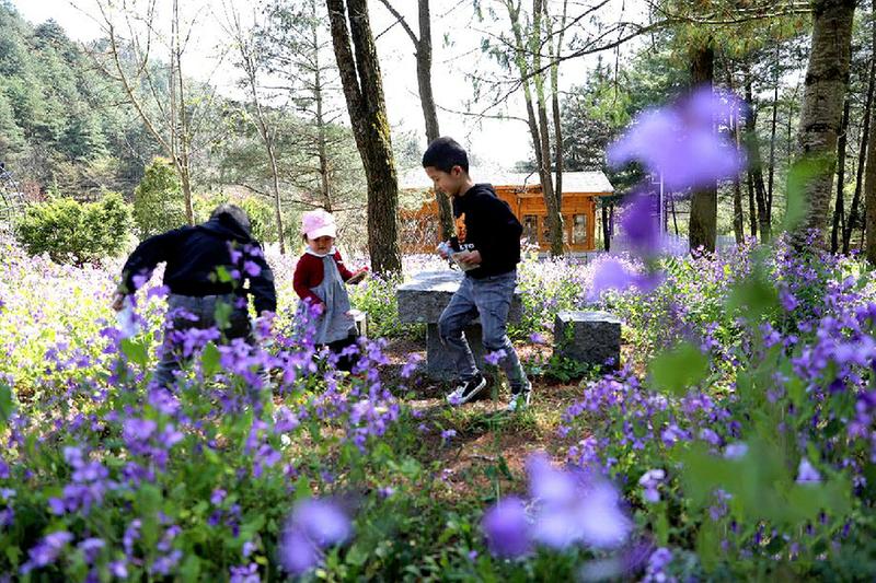 小朋友在秦岭上坝河国家级森林公园花间嬉戏。杨宁 摄