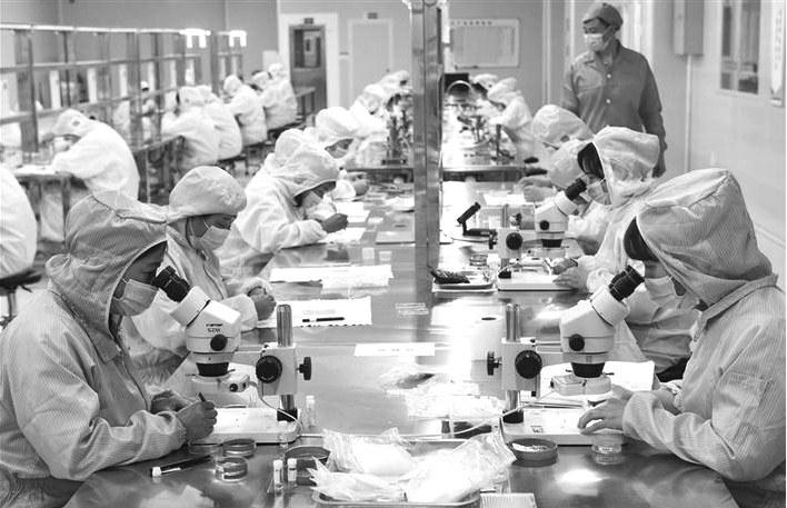 4月16日,在镇安芯木田科技有限公司生产车间里,员工正在组装、检验探针产品。该公司紧抓防疫生产两不误,员工复工率100%。目前公司在手订单任务已经排到今年7月。