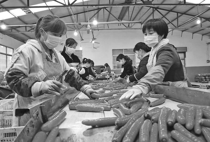 近年来,渭南市大荔县荔盛红萝卜扶贫产业园积极响应国家乡村振兴战略,采用“合作社+土地托管+贫困户”的产业扶贫模式促农增收。目前,该产业园已对50多户贫困户土地进行了托管去年为在产业园务工的86名贫困家庭劳动力人均发放工资12000元,带领群众走出了一条产业带动脱贫的致富路。图为农户们正在对红萝卜进行加工。