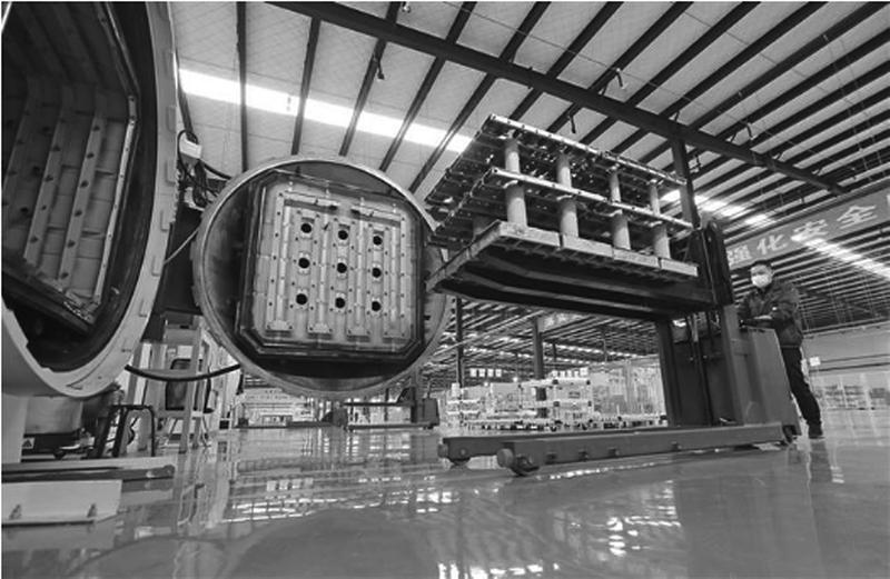渭南美益特发动机减排技术有限公司,主要从事车用发动机节能减排控制技术研究与设计、制造、销售,其核心技术废气再循环系统(EGR)是满足国六排放法规的关键和必要技术。图为技术人员将料架送回纤焊炉内。