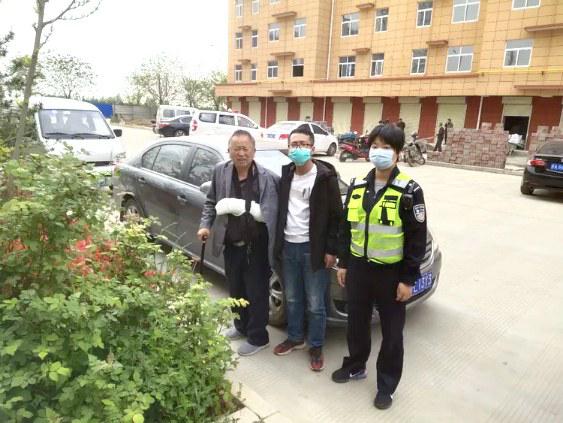 4月15日下午,一位手打石膏的老人在其儿子陪同下来到大队,寻找4月9日他意外摔倒受伤救助他的女交警当面表达感谢。