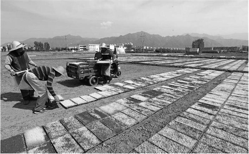 近日,在秦岭脚下的西安高新区东大街道西庄村,村民将刚出苗的秧盘摆放在育秧田里。据了解,今年东大街道西庄村将种植水稻300亩,并与相邻的北大村一起打造东大千亩水稻基地,形成集农业、农产品加工、休闲、旅游于一体的现代农业文化项目综合体。