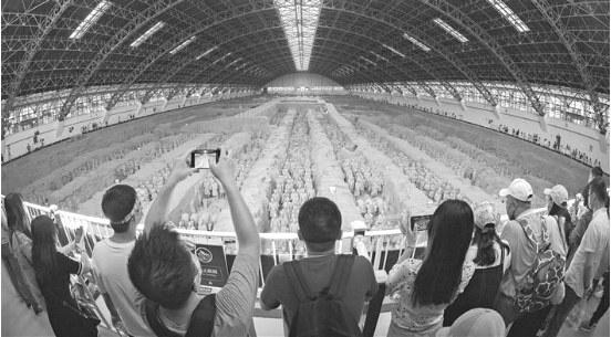 “五一”期间,秦始皇帝陵博物院全面推行了线上提前预约购买门票政策。游客通过博物院官方票务网站、微信公众号及OTA网络平台等渠道预购门票。据悉,博物院每日开放时间为9∶00—16∶00。16时停止检票。博物院单日最大观众接待量不超过8000人。图为游客在秦始皇帝陵博物院一号坑参观。