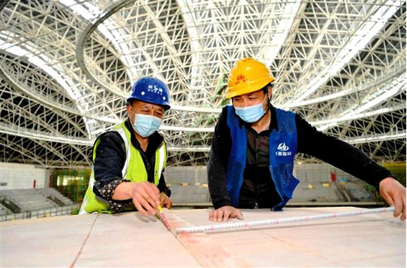 作为十四运会闭幕式备用场馆,陕西奥体中心体育馆目前已进入场馆建设倒计时阶段。节假日期间,施工人员在加班加点制作天花板造型。