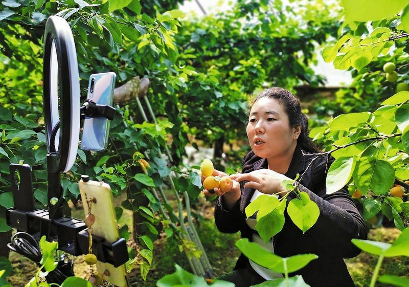 “手机成为新农具,数据成为新农资,直播成为新农活”,近年来,渭南市不断完善县域电子商务公共服务体系,以电商为“媒”助力贫困群众脱贫致富。图为大荔县埝桥镇北黄村贫困户马宁通过网络直播帮助村民销售农产品。