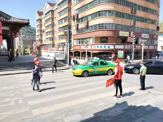 民警与志愿者在人员密集的新民街路口,开展交通安全法律法规、交通安全常识宣传、教育等活动,发放交通安全宣传资料等,培养提升市民的交通安全意识。