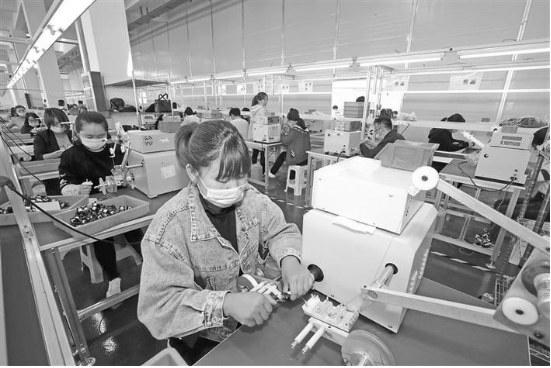 合阳县苏陕协作扶贫产业示范园陕西飞磁科技有限公司,主要从事高低频电子变压器等的研发销售,预计可解决五百人就业。图为工人正在给高频变压器绕线。