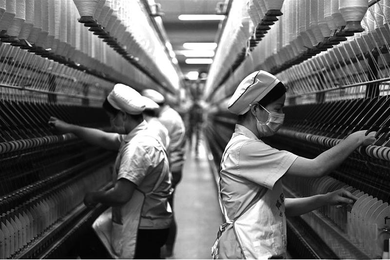 全国人大代表何菲是陕西省咸阳纺织集团有限公司一分厂的纺织工人。她2005年参加工作,现为“赵梦桃小组”第十三任组长。在抗击新冠肺炎疫情过程中,何菲带领工友坚守在复工复产一线,抢抓工时完成生产任务。她表示,要在新时代继续传承发扬好“梦桃精神”,为纺织行业高质量发展贡献力量。图为何菲(右)在生产车间工作。