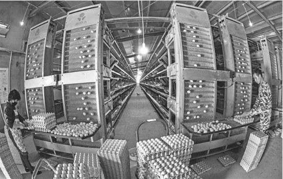 近日,在安康市石泉县城关镇东风村现代化鸡场,工人正在收鸡蛋。东风村种养殖专业合作社2018年获得苏陕扶贫协作项目资金200万元,建设了一座1000平方米的标准化蛋鸡养殖场,并带动101户贫困户发展养蚕、畜牧养殖及黄花菜、魔芋、辣椒等产业。目前,该合作社饲养的2.8万只蛋鸡日产鸡蛋2.5万枚,日销售收入1.3万余元。