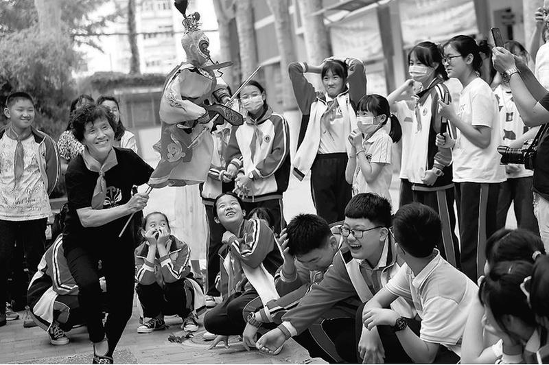 “六一”儿童节当天,在我国2020年﹃文化和自然遗产日﹄即将来临之际,由未央区文化馆组织举办的非遗保护进校园活动走进东元路学校。多名非遗传承人现场传授非遗手工技艺,为孩子们带去了一场传统文化的盛宴。图为民间艺人为同学们展示传统木偶技艺。