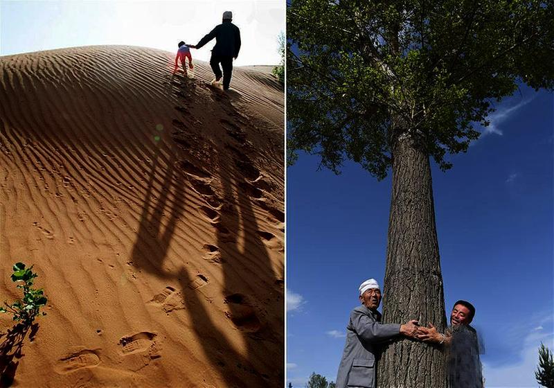 拼版照片左图:1998年8月,榆林市靖边县郭成旺老人带着曾孙行进在沙漠中。老人的希望是:子子孙孙植树造林,直到沙漠都变成绿洲;右图:2020年5月22日,99岁的郭成旺老人(左)与孙儿郭建军抱着当年栽下的第一棵杨树,向参观者介绍当年植树的情景。1984年,郭成旺承包了离家10公里处的荒沙地,带领全家常年吃住在沙地的简易房里,为4.5万亩沙漠披上了绿装。如今,他家一年的生态补偿及林下经济收入达40余万元。