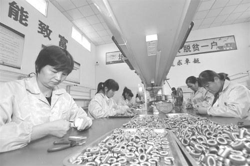 武功县大庄镇天乙电子社区工厂投资约三百万元,主要生产贴片电感、环型电感等电子元器件,主要用于电脑、电视、洗衣机等家用电器主板配件,目前社区工厂已经解决就业五十人,人均每月增加收入一千五百元至二千元。图为工人在进行环型电感校脚。