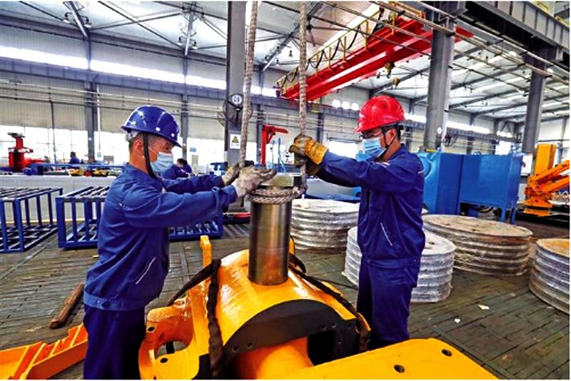 宝鸡石油机械有限责任公司是中国石油天然气集团有限公司的全资子公司,该公司产品主要包括1000米—12000米全系列陆地钻机、车装钻修机以及海洋钻井系统等50多个类别1000多个品种规格,其中15大类54项产品获得了美国石油学会API会标使用权,产品远销美洲、非洲、欧洲等地60多个国家和地区。图为工人在连接585游车大钩。