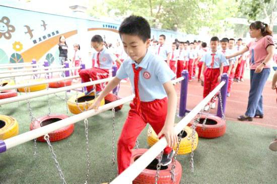 韵律操结束后,室外荡桥项目颇受学生喜爱。田涯 摄 郭大爷家住西安市雁塔区后村小区6号楼,阳台窗户正对着红星小学操场,他的孙子郭天晨在那儿读三年级。每天9时,郭大爷都会来到窗前,在课间活动的人群中寻找孙子的身影。最近,他发现课间操跟以前不太一样:口令从传统的“一、二、三、四”变成了欢快的歌曲《葫芦娃》,做完课间操还有各类体育活动。