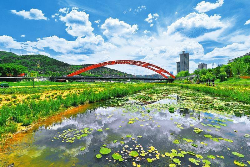 6月的延安,碧水蓝天,风景秀丽。在延安市区延河湿地公园,碧绿的荷叶在微风中摇曳,为闹中取静的延河湿地公园增添了几分雅致。