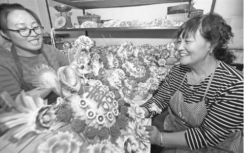 曹芳侠是渭南市第三批市级非遗项目合阳面花代表性传承人,她制作的合阳面花主要用于城镇和农村婚嫁、小孩满月、老人过寿等,年收入达10万元左右。图为合阳县坊镇坤龙村的曹芳侠(右)和女儿贾蕊艳在制作面花。