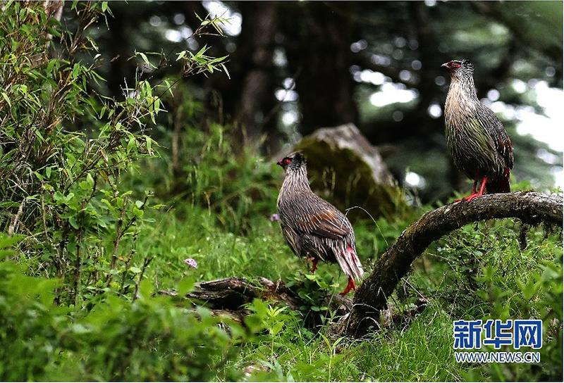 在海拔2800米以上的秦岭高山区针阔叶混交森林里,生活着一种国家二级保护动物—血雉。血雉是高寒山地森林及灌丛雉类,常常集群生活。随着季节变化,血雉由低海拔向高海拔迁徙。图为国家二级保护动物血雉在林间活动。