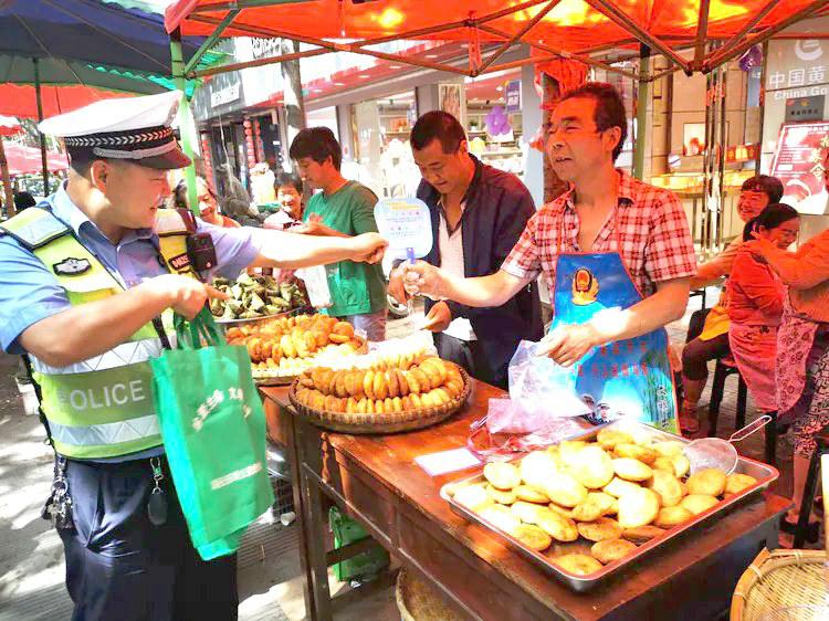 活动期间民警走到油糕粽子摊位前、通过发放宣传资料、印有交安全知识的围裙、手提袋、小扇子、等宣传品,讲解典型事故案例、张贴宣传海报等多种方式,全方位、多角度向买卖粽子油糕市民宣讲夏季道路交通安全常识及端午节出行注意事项。