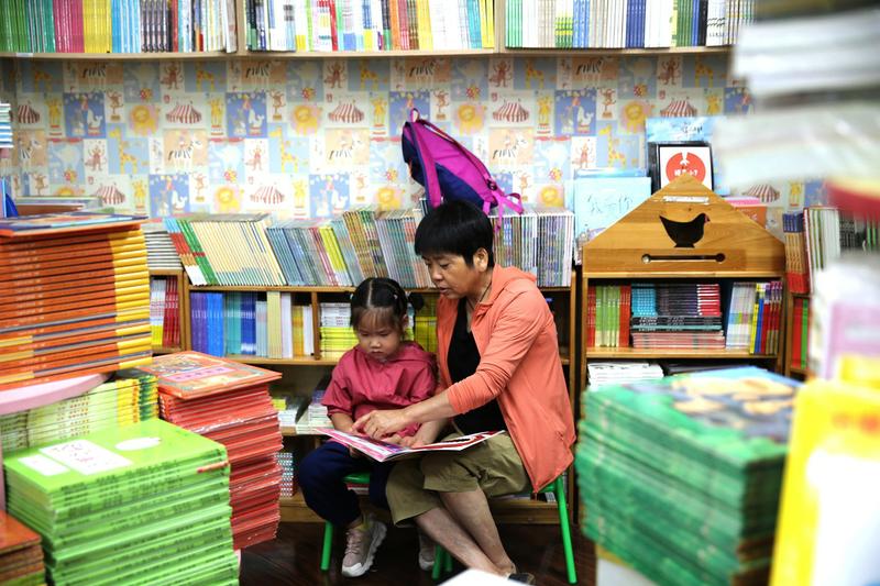 7月15日,在西安市新华书店一位家长陪着孩子一起看书。