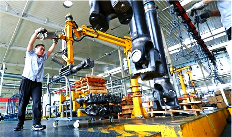 陕西蓝通传动轴有限公司主导产品重型汽车传动轴处于国内行业先进水平,被科技部认定为国家高新技术企业。今年上半年,该公司累计生产汽车传动轴总成20.02万根,同比增长19%,产值1.85亿元,同比增长16%。图为工人在涂装线上熟练操作、有序工作。